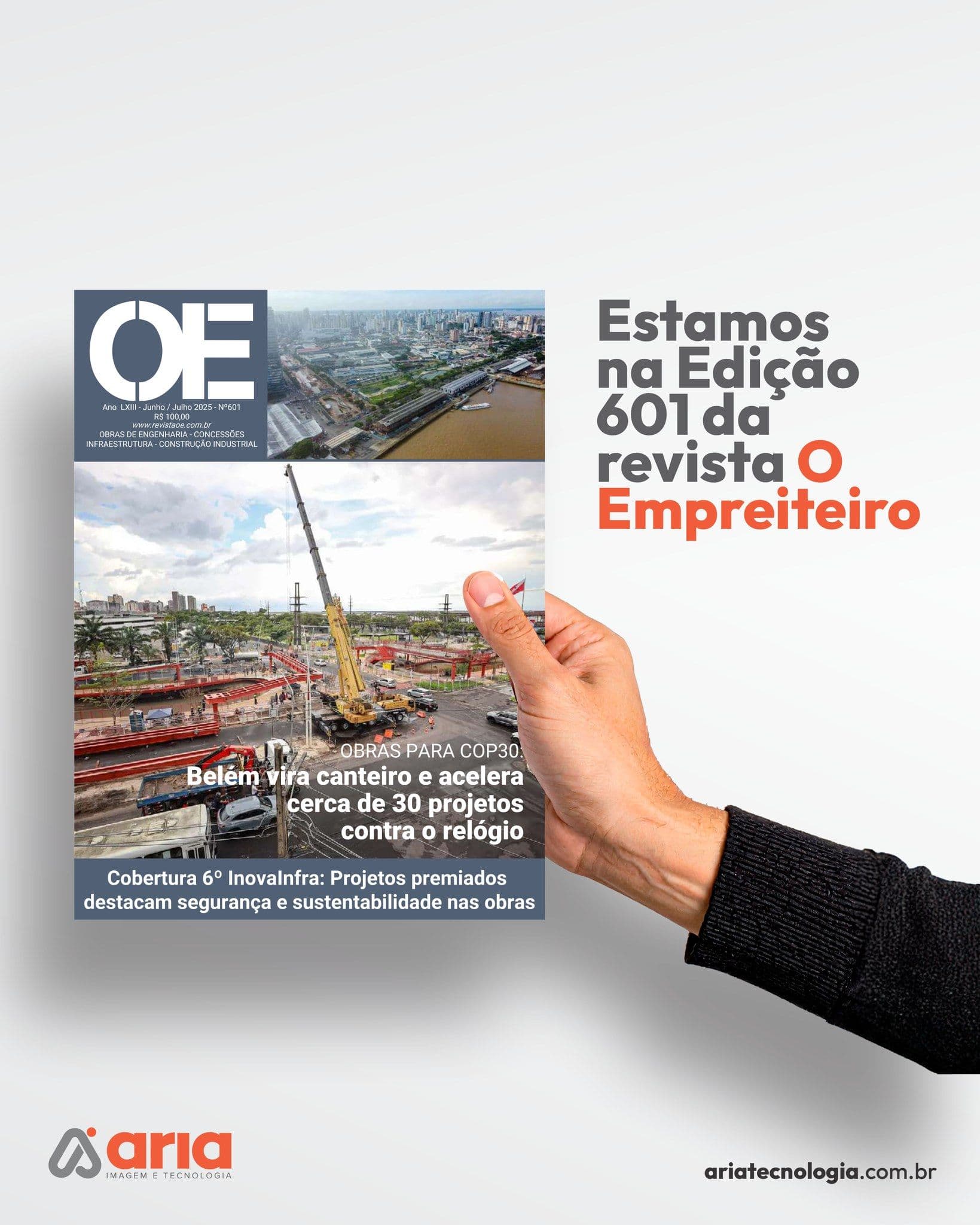 A capa da revista traz a manchete “Belém vira canteiro e acelera cerca de 30 projetos contra o relógio” e faz referência ao avanço da infraestrutura urbana da capital para sediar a COP30. Dentro dessa cobertura, a Aria se destaca como empresa parceira em levantamentos topográficos, mapeamentos de precisão, escaneamento 3D de áreas urbanas e monitoramento técnico não destrutivo, apoiando projetos premiados pela eficiência, sustentabilidade e segurança.