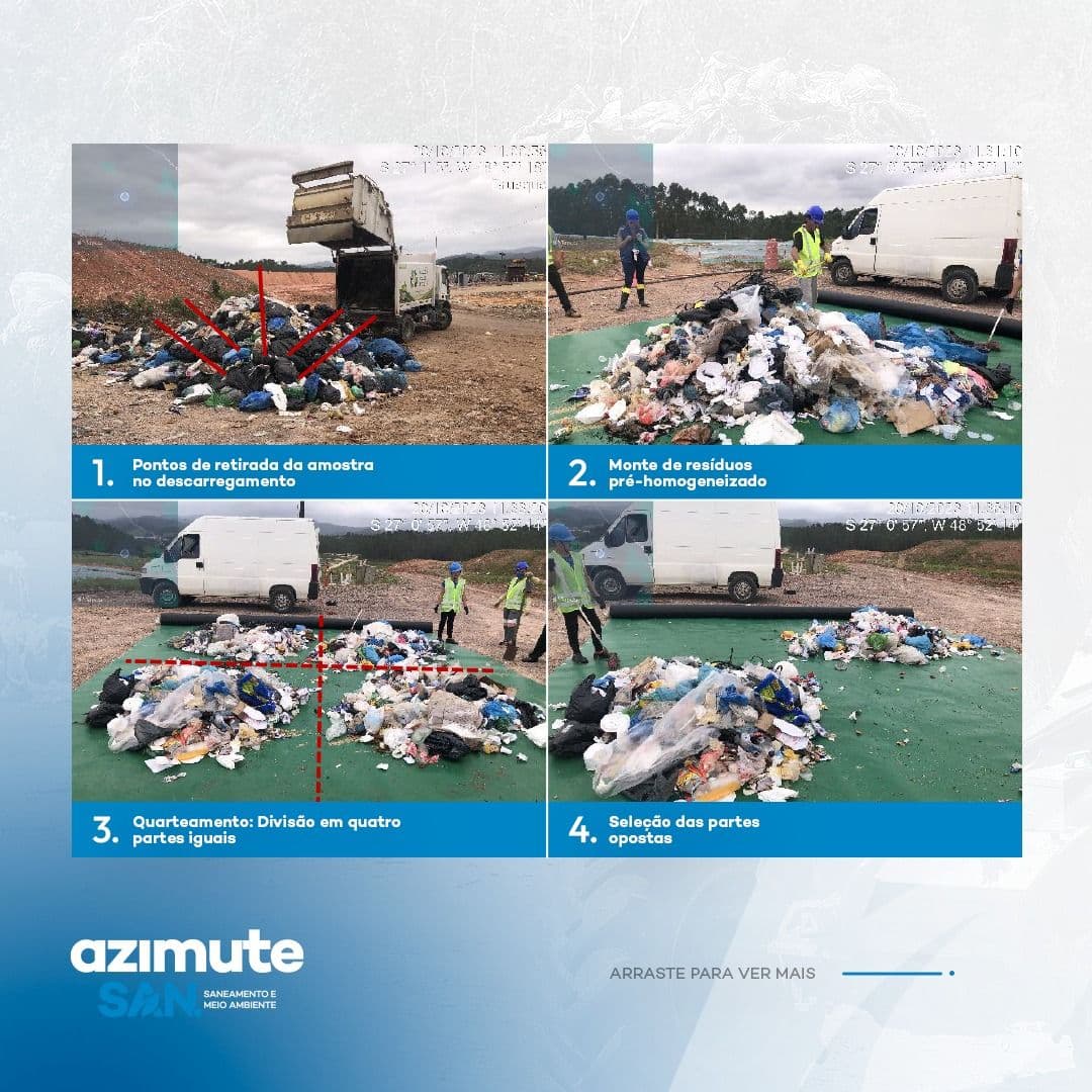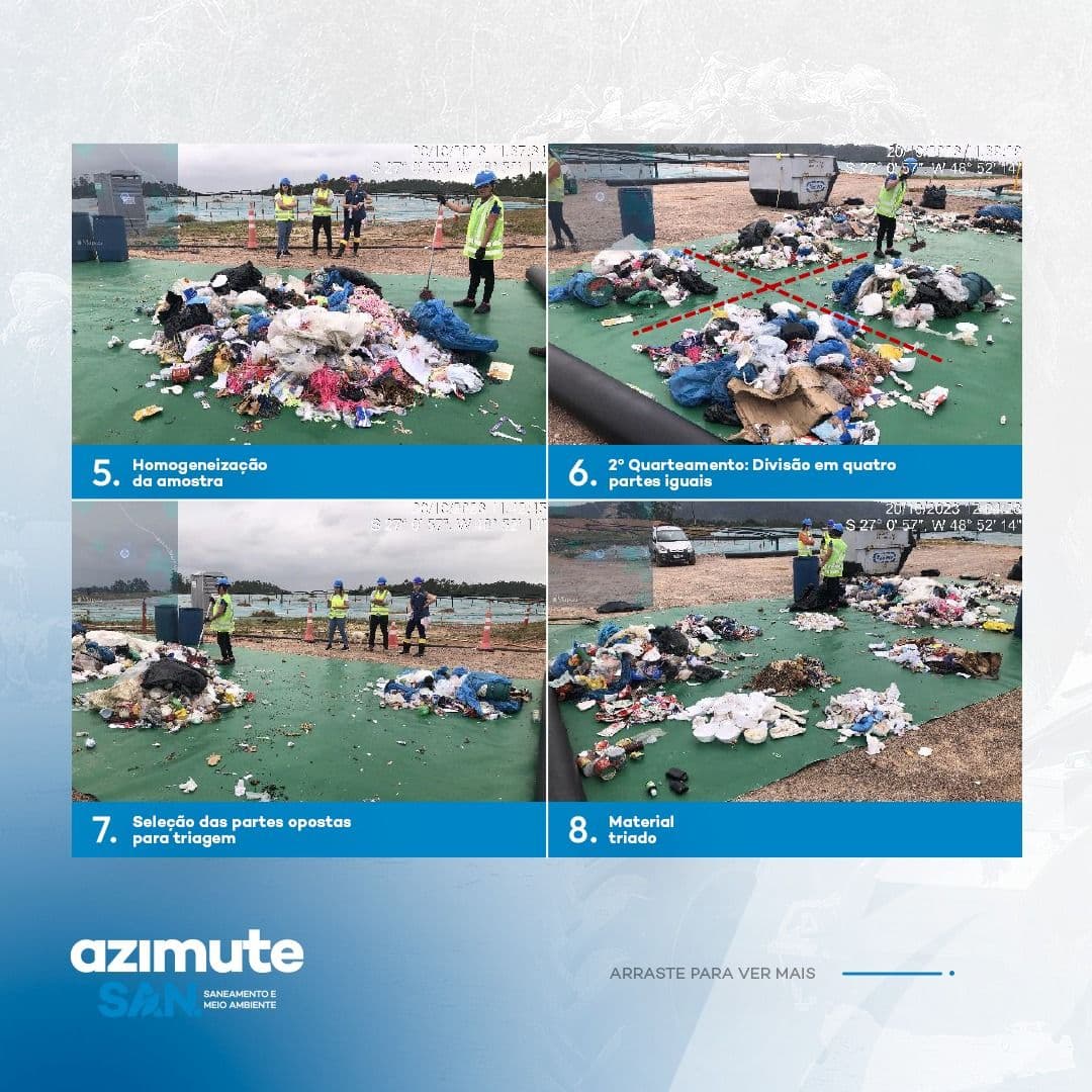 A metodologia utilizada pela Azimute San - Saneamento e Meio Ambiente para a realização de estudos gravimétricos segue as definições da NBR 10.007/2004, norma vigente no segmento de amostragem de resíduos sólidos. A norma apresenta procedimentos e diretrizes, fixando os requisitos exigíveis para a amostragem deste tipo de material.