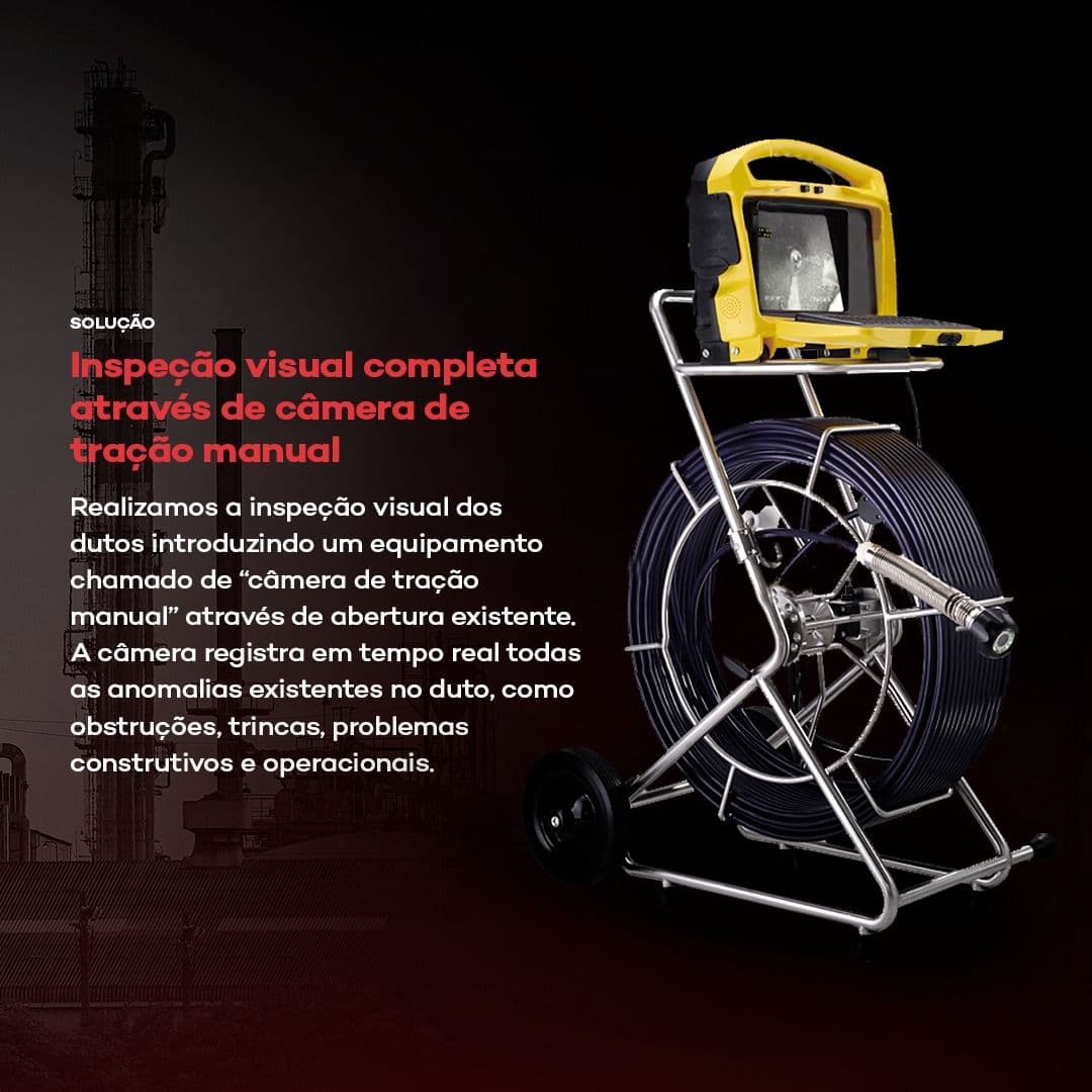 Realizamos a inspeção visual dos dutos introduzindo um equipamento chamado de “câmera de tração manual” através de abertura existente. A câmera registra em tempo real todas as anomalias existentes no duto, como obstruções, trincas, problemas construtivos e operacionais.