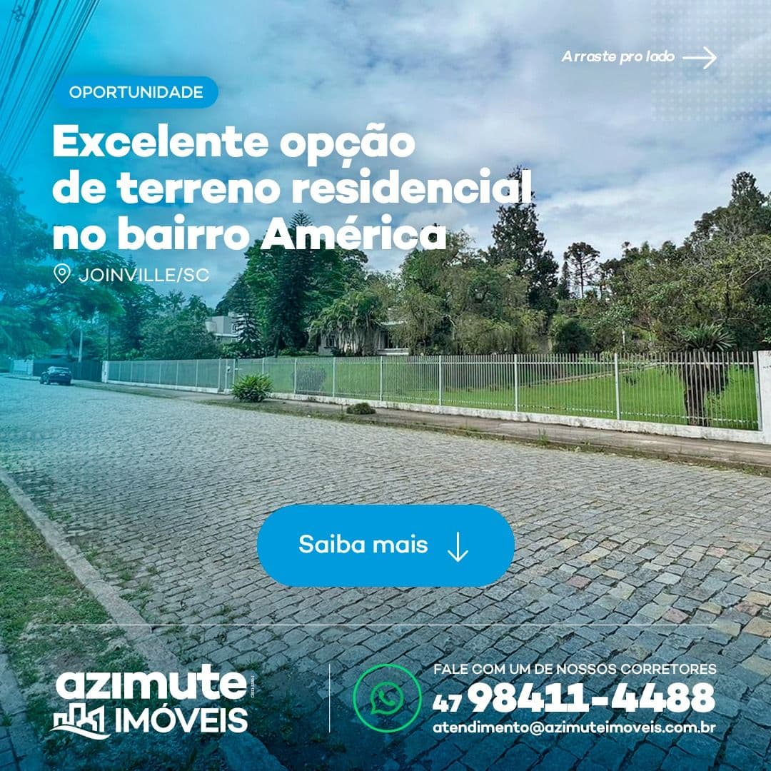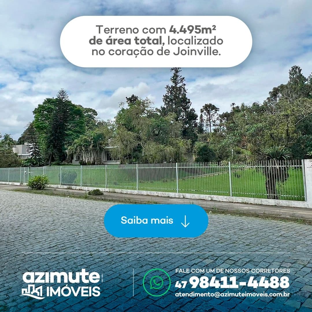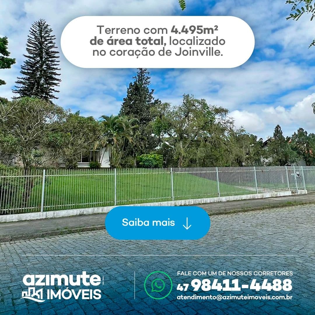 Um excelente terreno residencial no bairro América, no coração de Joinville. Conta com 4.495m² de área e uma casa de aproximadamente 600m². É o terreno ideal para construção de condomínio de casas de alto padrão, em uma área super nobre da cidade.