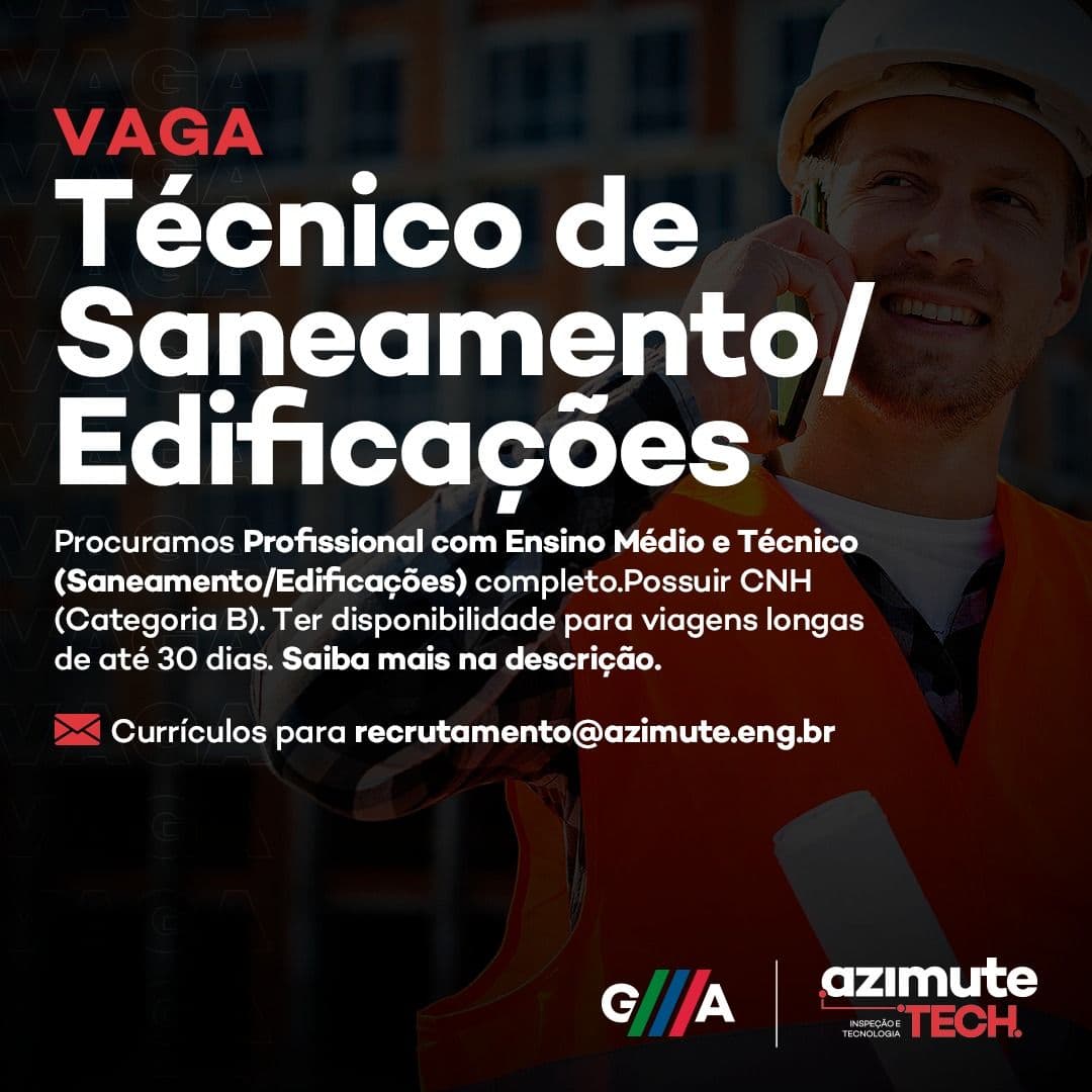 Procuramos Profissional com Ensino Médio e Técnico (Saneamento/Edificações) completo. Possuir CNH (Categoria B). Ter disponibilidade para viagens longas de até 30 dias.