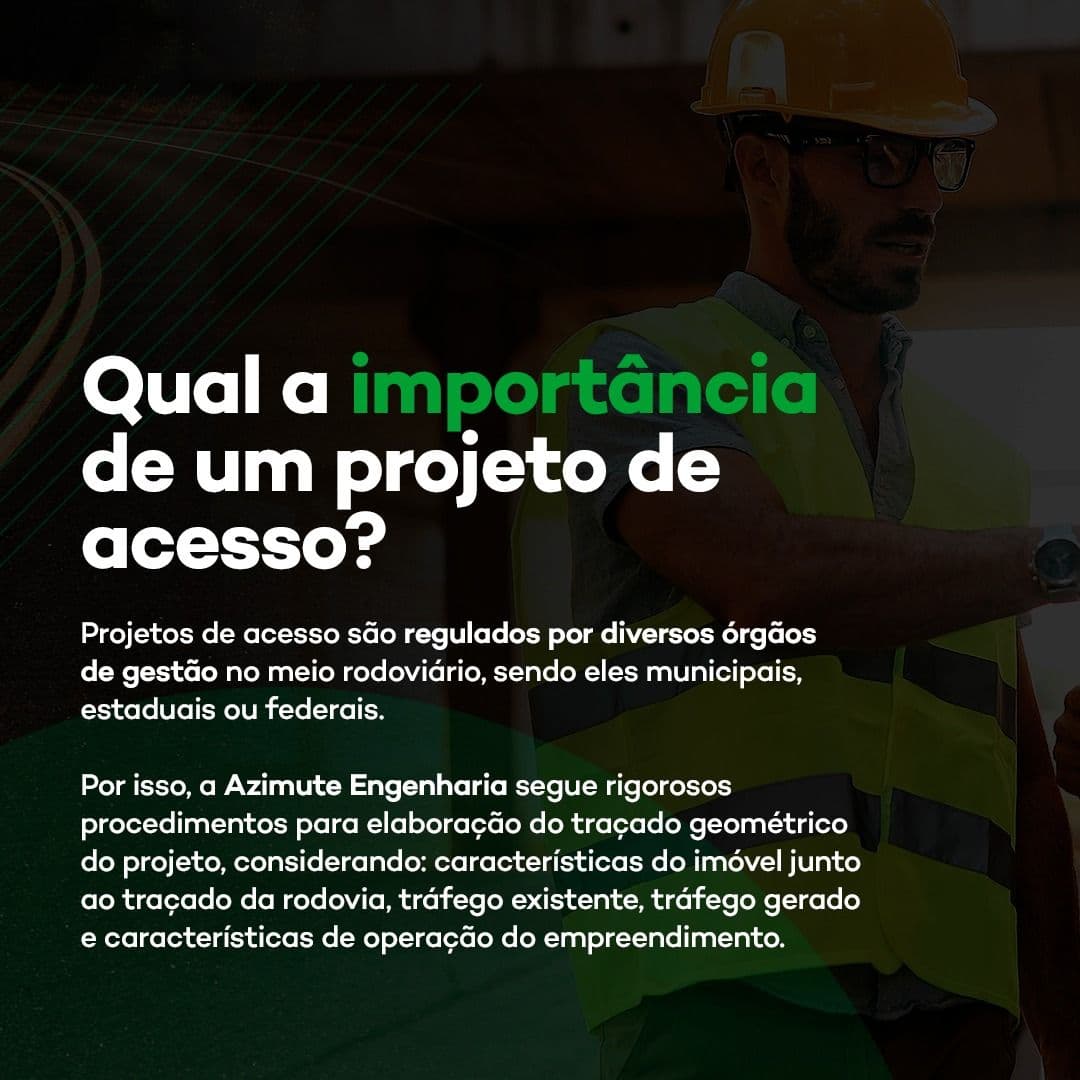 Projetos de acesso são regulados por diversos órgãos de gestão no meio rodoviário, sendo eles municipais, estaduais ou federais. Por isso, a Azimute Engenharia segue rigorosos procedimentos para elaboração do traçado geométrico do projeto, considerando: características do imóvel junto ao traçado da rodovia, tráfego existente, tráfego gerado e características de operação do empreendimento.